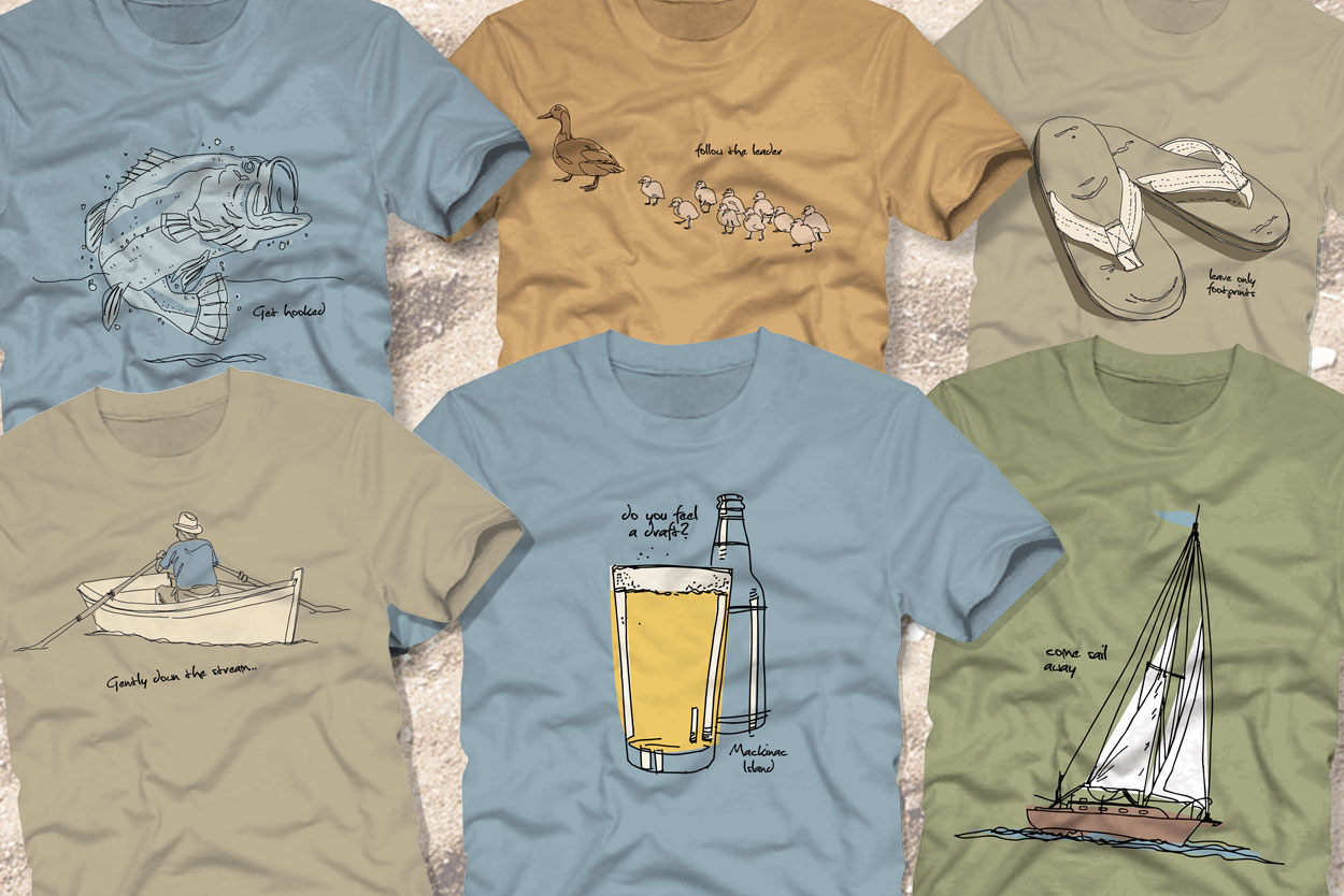 A program of loosely drawn illustrations for apparel shops catering to a laid back lifestyle.